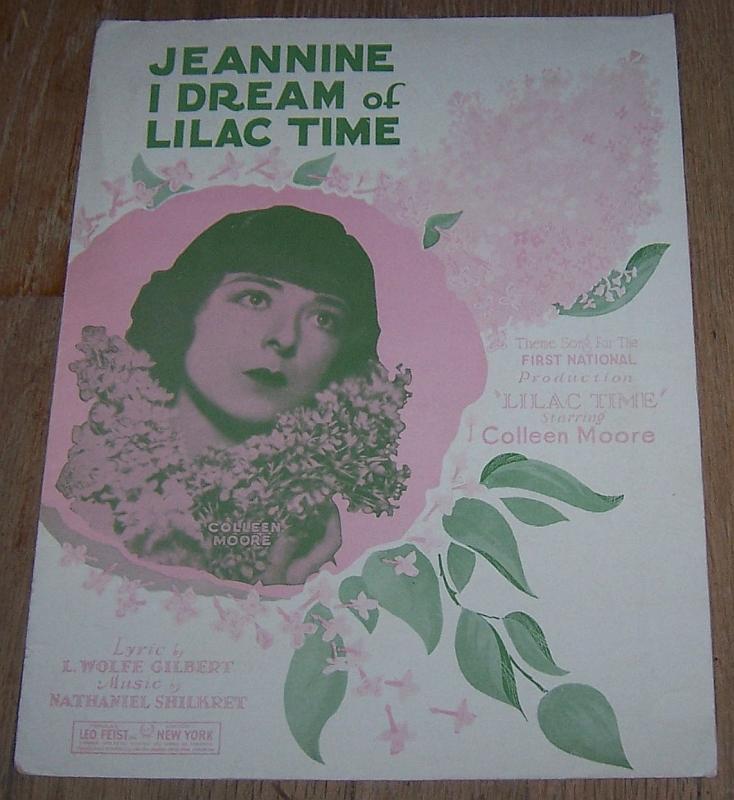 Jeannine I Dream of Lilac Time Theme Song for the First National Production Lilac Time Starring Colleen Moore. Lyric by L. Wolfe Gilbert and Music by Nathaniel Shilkret. 1928 Leo Feist. Sheet Music is in good condition, wear at edges, spine is taped, previous owner's name on front cover