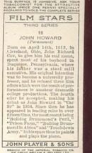 John Howard Film Star Tinted Card 1938, Third series #18, Studio signed (artists signs original & then they print signature on card or photo) features born 1913 in Cleveland Ohio, Spent most of his boyhood in Pennsylvania where his father was a steel mill executive. His original intention was to become a college professor. Refused 3 film offers as a result of performances in dramatic college production's Accepted the 4th offer and appeared in Car 99. Later appeared in leading roles in over 15 films. by the John Player & sons company branch of the Great Britain & Ireland Ltd, Mint condition This cigarette card is 1 1/2 x 2 1/2" Please note photo is larger than actual card. Postage in the USA will be 34 cents & other countries will be apox 1.00 you pay only actual postage, no more than 5.00 if you want global priority.