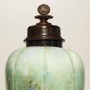 Our magnificent ribbed vase with cover by Knud Valdemar Engelhardt (1882-1931) for Royal Copenhagen dates from circa 1916 and features a unique celedon glaze with abstract blue and white flower heads and patined bronze cover with spherical reticulated finial. 29 in tall and 12 in across and in good condition. Stamped ROYAL COPENHAGEN with three wave painted mark and signed with the artist's cipher, VE and K 9.