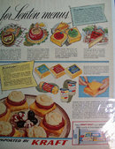 Krafts Cheese Lenten Menus 1952 Ad. This color two page March 11, 1952 ad states Krafts cheese Parade for Lenten Menus. Fancy Cheeses for Desserts, Snacks, salads. Here are nine inspirations to add goodness to Lenten Meals. Recipes and pictures of Golden Tuna Shortcake and Cheese Tomato Puff Sandwiches. Also shows 9 different cheeses and ideas for each. Magazine tear sheet picture is taken through plastic and may show wrinkles or crookedness that is not In the ad. This original magazine tear sheet measures 9 3/4 inches wide by 13 1/4 inches tall.