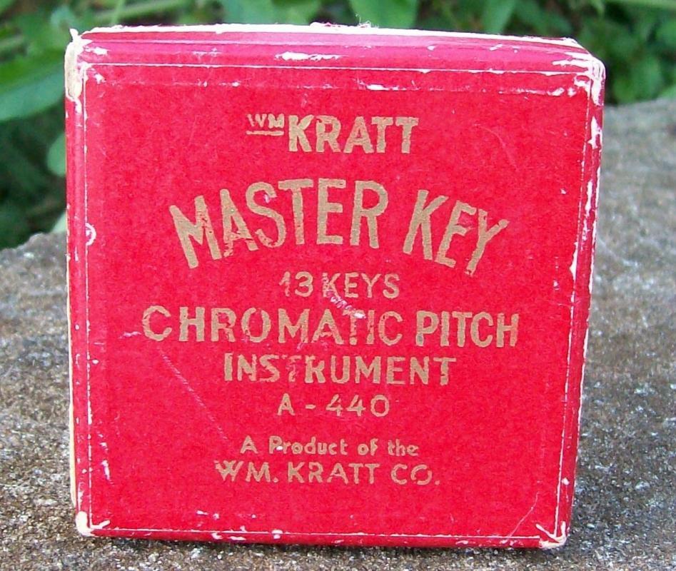 William Kratt "Master Key" chromatic pitch instrument. 13 keys, model A-440, patented 1931. Hinged cardboard case with instructions printed inside, measures 2.75" square x .75" thick. Round instrument has a few small rust spots on the unpainted side, otherwise in good condition. Sold as is. Inglenook Antiques...Established 1989.