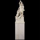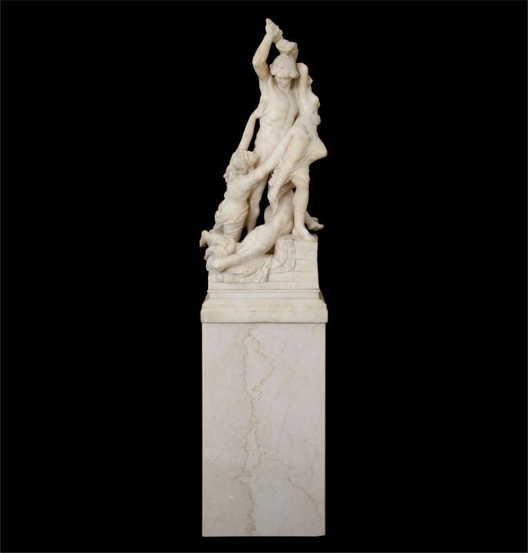 Our alabaster sculpture depicts The Rape of Polyxena, after the original marble completed by Pio Fedi (1815-1892) in 1868, installed in the Loggia dei Lanzi, the open-air museum in the Piazza della Signoria in Florence, Italy. Depicted is Achilles, the Greek warrior, abducting Polyxena while striking Hecuba with her brother, Troiius, laying beneath. 40 x 17.5 x 15.25 inches, on marble pedestal measuring 30 inches tall and matching the width and depth of the sculpture. Apparently unsigned.