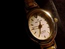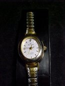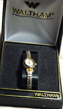 Lovely Ladies Waltham Gold tone Watch with a stone at 12:00. The watch works excellently and comes with a brand new working quartz battery. The attractive stretch links band has the gold plating intact for about 1" on either side of the watch. However the rest is either worn off or was never applies to begin with. The watch crystal has few very microscopic scratches that are only noticeable with the high magnification of a jewelers loop.