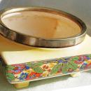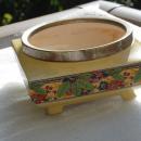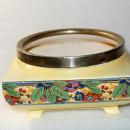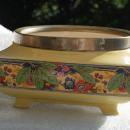 Lancaster & Sons Ltd Hanley England Footed Bowl, Yellow with Flowers and Leaves Large Bowl with EPNS Silver plated Rim. Circa 1920s-30s. I have seen this described as a salad bowl but I think it is a berry bowl. In very good condition for age No chips, No cracks, No repair. There are crazing in glaze on the bottom , some small amount of wear on the leaves of the transferware art and a few small stain marks inside of bowl and there are small age cracks in the metal band.