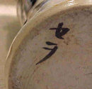 Stately and subtle, this tall vase exemplifies the virtues that have made Oribe stoneware favored by Japanese tea ceremonial connoisseurs and others for centuries. The soaring form and intentionally coarse surface make a monolithic background for the underglaze iron-oxide designs of weathered pinetrees on one side and the cavelike scene of "hanging persimmons" suspended from a slanted double border of latticework on the other. A green mantle of glaze engulfs the upper portion, a surprise of purplish-red bleeding out of the lower edges -- an effect I associate with wares of the late Nineteenth Century to the early Twentieth Century, the period of this piece. Condition is perfect. Approximately 11-1/4 inches tall by 5-1/2 inches at the largest diameter.
