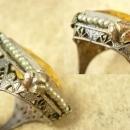 This beautiful sterling ring is a great period piece from the Edwardian era where tiny seed pearls were used in many of the jewelry settings. .It has sterling on all the parts of the ring except for the rose gold filled corners which are tiny leaves.This setting is 1" long and has wired faux teeny seed pearls that frame the stone. This is a size 7. Not sure if is is simulated or real. The inside back of the band reads sterling. The filigree work on each side is just gorgeous and you can tell when this was first made, a lot of attention to detail was given to it. This has not been cleaned or polished and retains its original patina. VintageSparkles offers Layaway on all our pieces regardless of which site it comes from.All layaway payments will need to be in the form of a check or money order only. Please remember that vintage & antique items are not mint, nor are they perfect but they sure are full of old history and charm. Please use photos to make your decisions and read our policies prior to buying so you can have an excellent experience with us. Please use this number when ordering ga4450217 . If you want to see more of these pretties visit our gallery on pinterest where you can see all our pieces at once http://pinterest.com/etsyvsparkles/sparkles-in-my-etsy-store/