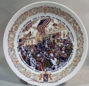 Le 11 September 1777 Pendant La Bataille De Brandywine. On the bottom of the plate it readsLe Marquis De Lafayette Blesse A La Jambe Encourage Et Lance Ses Hommes A L'Assaut. Lafayette wounded in the leg encourages and flings his men into the attack. This is plate four of the Lafayette Legacy Collection. issued by Bradford Exchange with certificate of authenticity. It is done in biilliant blues and tans. The border design by Restieu was taken from the carvings of the solid gold hilt of the Sword of Honor commisioned by the Congress of the United States and presented to General Lafayette in 1779. On the back it states it is Porcelaine by Limoges of France. It has the plate number. States it is a Premiere Edition. In French on the back of the plate it gives some details of Lafayette showing his courage during his first time under fire. This is translated in English in the brochure. Original packaging. In mint condition. Measures 8 1/2"