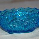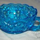 L.E. SMITH BLUE GLASS HANDLED NAPPY BOWL QUINTEC HERITAGE 5.5". This is a L.E. Smith Turquoise Blue Pressed Glass Nappy Candy Dish Bowl Loop Handle Saw Tooth Rim Vintage 1960s. This is a beautiful finger-loop handled glass candy or nut dish. The sides feature arches, buttons and starbursts with a sawtooth scalloped rim, finger loop handle and large sunburst and button on the bottom. The color is a deep aqua/turquoise/blue