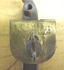 This is a very early patented saw tooth setter marked "S.F. LEACH & CO. SOLE MANUF'RS BOSTON MASS. PAT. JAN. 19, 1869" on the adjustable brass guide that is mounted to the top of the saw set. This tool is in good working condition with some minor pitting, but in fully functional condition. They are 7" long overall, and the spring loaded handle is still working after over 100 years. An unusual design with a triangular shape tooth setting bar that pivots from a center pin when the handles are brought together. Truly a unique saw set, of which I see very few of. Particularly rare with the 1869 patent date marked on it!