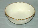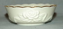 Small off white bowl with gold trim and a ribbon rose patter. The is a rose on the front and 3 roses on opposite sides connected by ribbons. The top measures 4 1/2" in diameter and the base is 2 1/2".