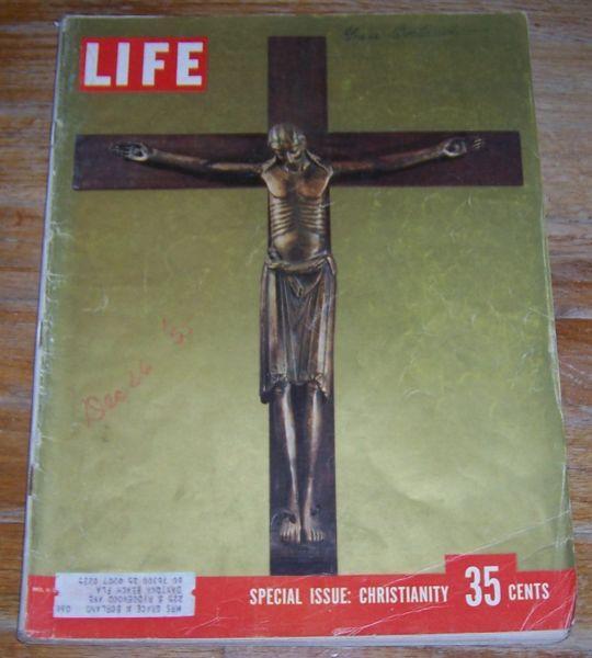 Life Magazine December 26, 1955. Special Issue Christianity. Articles include The Life of Christ by The Great Masters, The History of Christianity, Chicago Archdiocese, Billy Graham, Harvard Divinity School, Contemporary Church Architecture, Pope Pius XII, and more. Filled with period Christmas advertising and Life's Famous photographs. Magazine is in Good condition, wear at edges and spine, writing on front cover