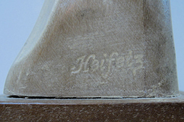 This delightful carved wooden statue of a faun from Heifetz dates from the 1950s or 1960s. Measures: 19 x 4.25 x 4.15 in. Heifetz was known primarily for their abstract and figurative lighting crafted from a variety of materials, including ceramics and carved wood. The influential design team of A.W. and Marion Geller created lighting designs for the firm. They also produced decorative sculpture such as this figurine which are more rare and highly collectible today. Distinguished by their horns, human upper body and legs and hooves of a goat, fauns are the place spirits of the untamed woodlands in Roman mythology. They were associated with satyrs, the wild and drunken followers of Bacchus. ( Bacchanalian )