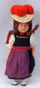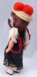 Adorable Little Black Forest German Girl Wind Up Dancing Doll. She measures 9" . She is made of composition and wearing crinoline & cotton garments and a straw hat with wool pompoms. On her back is marked "Made in Western Germany" She works fine. She winds up in the back and jiggles around in circles. The key was not attached but was a separate piece. However the key has been misplaced. Pliers can be used. I have not looked into what it would take to get a replacement key. I keep hoping I will find the one she came with. S