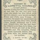 Loretta Young. Film, Stage and Radio Stars, #50 of a Series of 50. Ardath Tobacco Co, Ltd. Manufacturers of State Express and Ardath Cigarettes. Card is 2 3/4" high and 1 1/2" across. Card is in good condition, slight wear at edges.