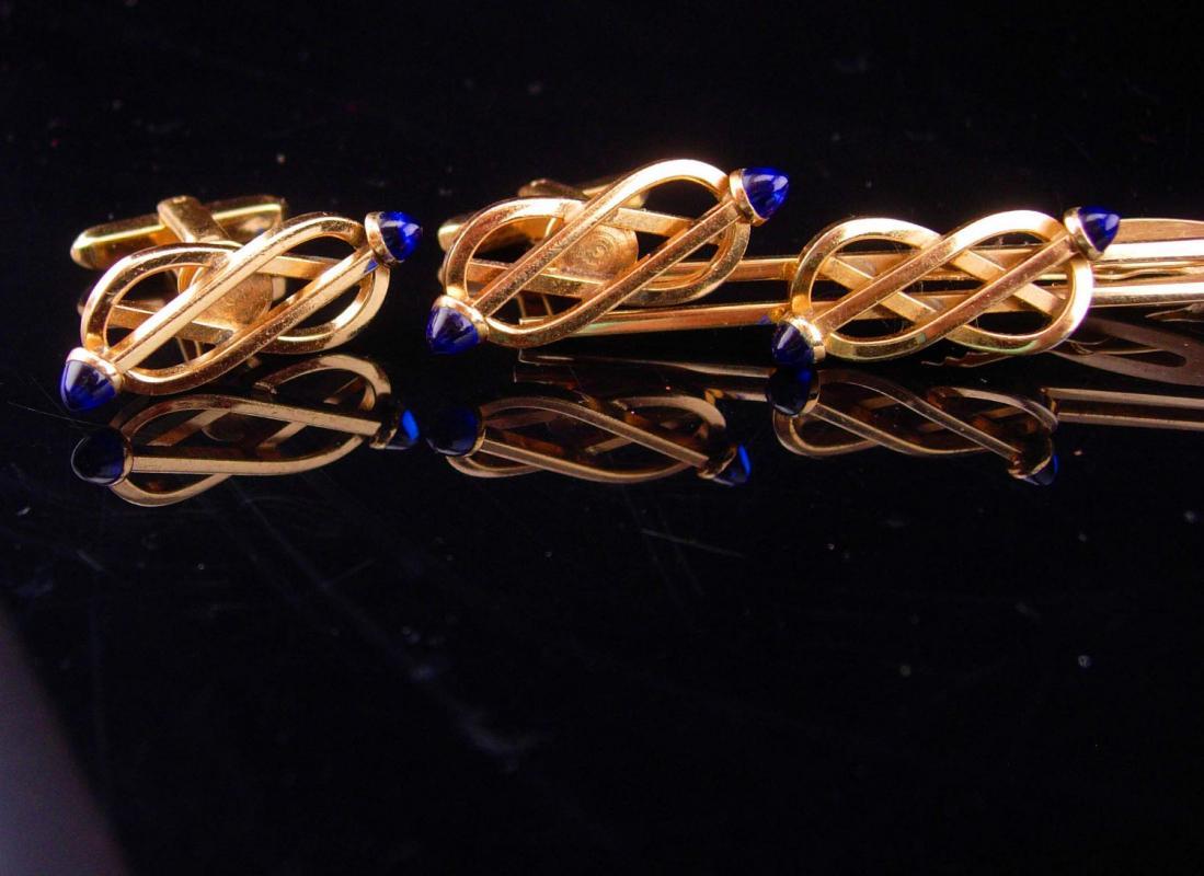 Beautiful blue jeweled ended love knot cufflinks that would compliment any wedding attire for an eternity ever lasting symbolic cuff jewelry or the yacht club member showing off a nautical knot. In any event a great pair of cufflinks . And remember, a personal well thought out gift shows you took the time to care about that special person in your life. Our items are classic, sometimes unusual and vintage and sometimes a little bizarre. Whether it is a memory from their past or something that reminds you of how special they are, purchasing from us is a unique idea that you can’t get from a store every day. Just say the word and we will wrap it and put a beautiful bow on it for you at no extra charge . ✽ All you have to do it watch them smile and enjoy their special gift ♪♪F And while you are getting ideas for someone else, take a peek at some of our OTHER items. We have neat old collectibles and ODDITIES and some are REALLY one of a kind BIZARRE! https://www.etsy.com/shop/NeatstuffAntiques?section_id=11469030&ref=shopsection_leftnav_4 Do we have personalized items? Sure!< https://www.etsy.com/shop/NeatstuffAntiques?section_id=11601160&ref=shopsection_leftnav_7) Did you think we forgot the ladies? � https://www.etsy.com/shop/NeatstuffAntiques?section_id=11875005&ref=shopsection_leftnav_8 We have mens accessories including cufflinks here: https://www.etsy.com/shop/NeatstuffAntiques?section_id=11469022&ref=shopsection_leftnav_2 Return to our home page here ∆ https://www.etsy.com/shop/NeatstuffAntiques _______________________________________ PRODUCT DETAILS…………………………………. ♥ Maker: Hickok ● Material: gold plate ∆ Size: see photo ◘ Weight: ( based on other cufflinks in comparison) medium ♦ Condition: >>>>>>>>>>>>>>>>>>>>>>>>>>>> Because these are vintage estate pieces and are vintage and possibly pre-worn so they are not considered new from the factory….. Please see photos for any wear or light surface scratches that come with age.☺………………. Sold as is and priced accordingly.. All cufflinks ( unless otherwise specified) are considered costume jewelry. We don’t polish these previously owned well loved pieces so we can keep the original patina. We try and photograph all of the pieces next to a ruler so you can see the actual size. All jewelry sold as found. We use the descriptions of any stones from the manufacturers titles when they were first produced. When we refer to the stones as moonstone or jade or garnet, for example, we are using how the original manufacturer of the pieces used them. We cannot guarantee the authenticity of a stone in a costume piece of jewelry. All pieces have been worn at least one time unless otherwise specified. Although the pieces we carry are unique and interesting they may have a little wear ( if any) but they sure have a lot of love that came with them when they were first purchased way back when. Just click on our photos for more close ups to help you see all the cool detail on each piece. __________________________________________ Our policies are listed here so please check them out prior to purchase https://www.etsy.com/shop/NeatstuffAntiques/policy?ref=shopinfo_policies_leftnav __________________________________________ WHERE can you see our NEW LISTINGS of jewelry and antiques? FOLLOW US ON FACEBOOK https://www.facebook.com/neatstuffantiquesonetsy/ (You can join us on pinterest here : https://www.pinterest.com/neatstuffonetsy/ ) or visit our other shop here https://www.etsy.com/shop/vintagesparkles I will be happy to combine shipping if you purchase from both. __________________________________________ DO WE ENGRAVE?: We Do not offer engraving services of any sorts as we are not equipped to do so I’m sure your local jeweler would be happy to do so, sorry for any inconvenience thank you. __________________________________________ Do you need to convert our US ring sizes to your country>? This page will be a big help. http://www.ringsizes.co/resources.html __________________________________________ IF YOU NEED A LAYAWAY PAYMENT OPTION PLEASE DO NOT HESITATE TO CONTACT ME ___________________________________________ ✈✈✈SHIPPING UPDATE*** Shipping rates for domestic and international delivery have skyrocketed! We ship priority mail ( so you will get is as quickly as possible) from FLORIDA IN THE USA to anywhere in the U.S. with insurance as a courtesy on orders over $20.00. If you wish to have another method of delivery (i.e. First Class International, overnight etc) PLEASE convo me before placing your order. …………WE NO LONGER SHIP TO MEXICO or ITALY………………………….. _____________________________________________ SAVE MONEY ***** My goal is to save both of us money on shipping. (Delays might occur because of bad weather and during holiday or peak times of shipping. Please plan accordingly with your orders. We cannot guarantee delivery dates, only give you the dates and times the post office gives us.) FEEL free to email us at anytime ✉ neatstuffantiques@gmail.com Return to our home page here ∆ https://www.etsy.com/shop/NeatstuffAntiques January13 2017