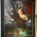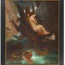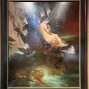 As many of 19th century artists, Leofanti was inspired by literature. In 1862, he painted this work depicting Roger delivering Angélique, from the 16th century epic novel Roland le Furieux by the Italian poet, Ludovico Ariosto, known as The Arioste. This specific subject has been represented by many artists during the 19th century, including Ingres, whose painting is in the collection of the Louvre. Gustave Moreau found inspiration for many of his works in this novel too. In the story, Angélique, the beautiful princess of Cathay's kingdom, has been brought to France by the famous paladin Roland in hopes of making her loving him. But Renaud de Mautauban Ferragus and Sacripant also desired her love. Angélique succeeded in escaping all these suitors, but during her escape she is kidnapped by pirates. They abandonned her on Ebude's Island, attached to a rock to be devoured by the Orc, the savage marine monster. A valiant knight saw this beautiful woman stranded, and enchanted by her beauty, Roger mounted his hippogriff, born from a griffin and a mare. The knight killed the monster with his lance and delivered the beautiful princess.