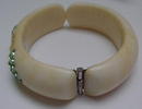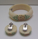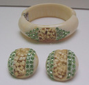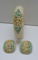 Beautiful and very very unusual Luicte set . It is cream colored with green rhinestones and a carved centerpiece. It has great matching earring. All the pieces are in great condition with no cracks or chips and no stones are missing