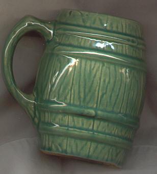 McCoy Pottery Barrel Shaped Tankard Mug. Green Glaze. 4 3/4" high 3" wide. Very good condition no chips or cracks.