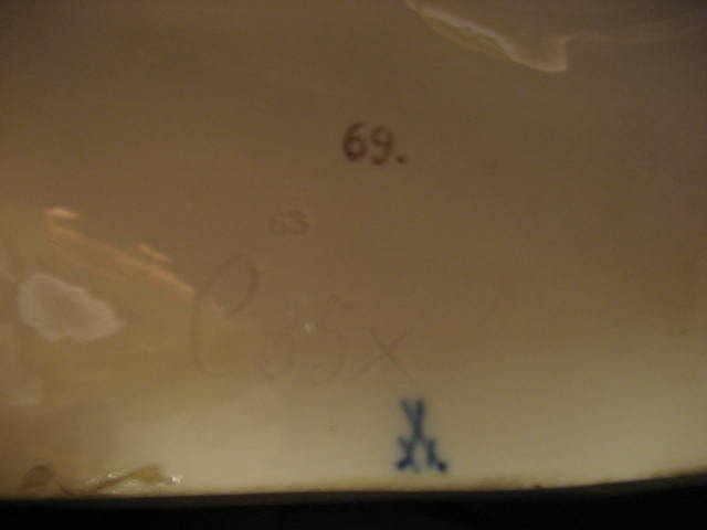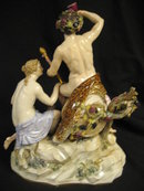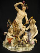 Meissen art pottery porcelain group figurine of a male celebrating with three admirers at his feet. With a chalice in one hand and a scepter in the other, the male figure is garbed in only a leopard skin loin cloth and a wreath of fruit around his head. From his face, you can tell the male is young, and there is finely detailed musculature on the body. The three admiring figures at the tall male's feet are as follows: [1]one winged putti with a chalice in hand, [2] a satyr (man with the legs of a goat) with a chalice in hand, and [3] a pretty young female servant (nude aside from the blue cloth draped over her right leg) with a pitcher in her left hand and her right hand on the male figure's uncovered leg. A beautifully hand painted and crafted scene, highly decorative, detailed, and richly colorful. The bottom of this porcelain figurine is marked with the authentic Meissen insignia of two underglazed blue crossed swords. Also, the bottom is impressed with what appears to be "C 35x" and the number "63", and stamped with the number "69." A highly desirable and rare addition to any collection of Meissen decorative arts.