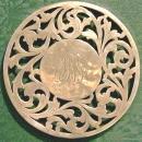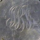 Sterling silver trivet with center monogram. Cutwork and chased pattern vines. Created by the Merrill Shops of New York, N.Y., in business from 1893-ca. 1931. Measures 5.5"d x 5/16" h. Marked "A92" with dragon mark. Minor dents & scratches, one flat spot in rim. No glass interior. Sold as is. Inglenook Antiques...Established 1989.
