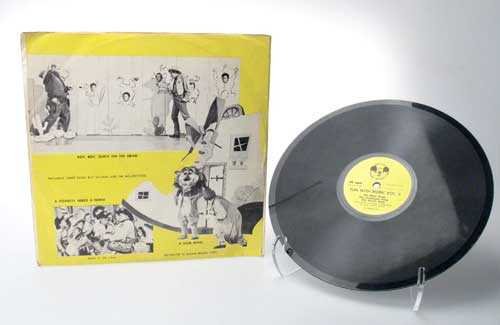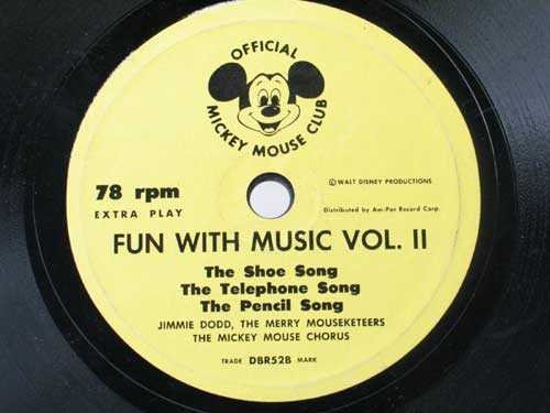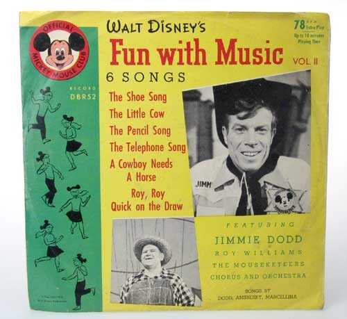 This 1955 Official Mickey Mouse Club record in its original picture sleeve is titled "Fun with Music Vol. II" and features 6 songs by Jimmie Dodd, Roy Williams and the Mouseketeers. Record number DBR52 inlcudes "A Cowboy Needs a Horse" and "Roy, Roy Quick on the Draw." Needs cleaning, light scratches, sleeve has come unglued on one side.