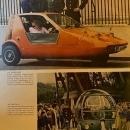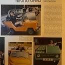 Micro Cars 1970 Article. This 3 page Color December 11, 1970 article states Micro Cars, mighty small and getting bigger all the time. Picture shows William the French Designed and Italian Made Midget. The Fiat 500 Original Mini, Biggest Micro. AWS Piccolo Munich's two cylinder. The Bond Bug, British Leylands Three Wheeler. Automodule The Experimental from Paris. Magazine tear sheet picture is taken through plastic and may show wrinkles or crookedness that is not in the ad. This original magazine tear sheet measures 10 inches wide by 13 1/4 inches tall.