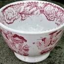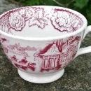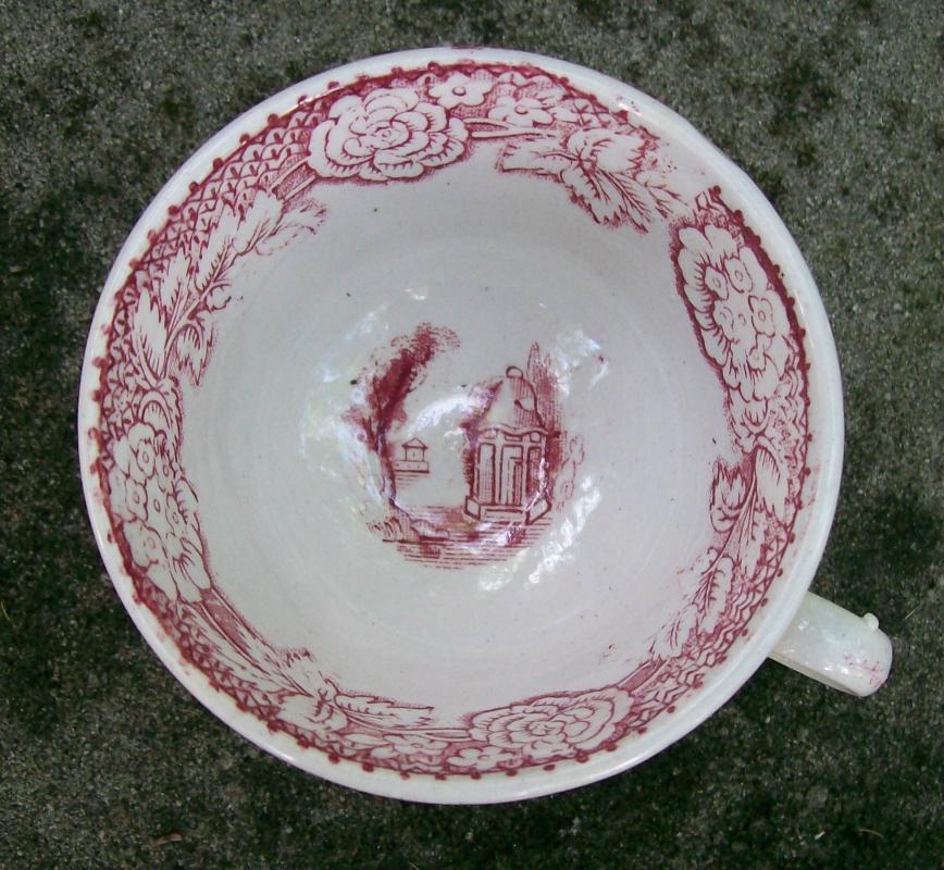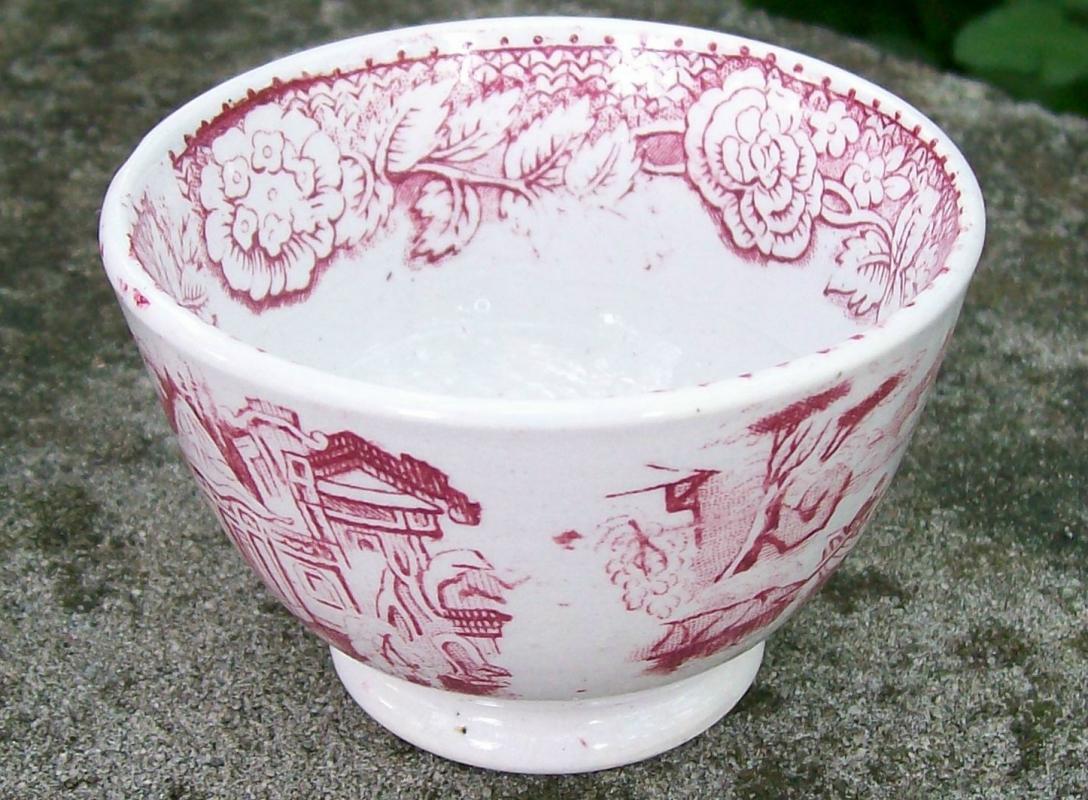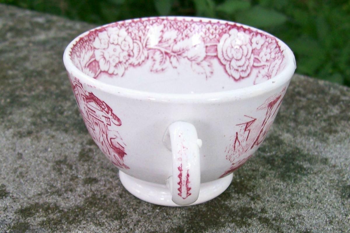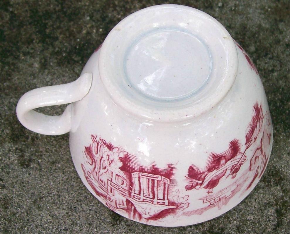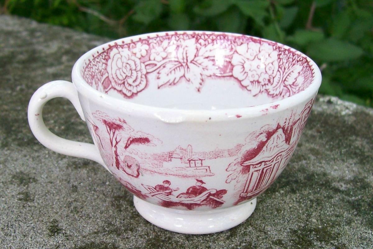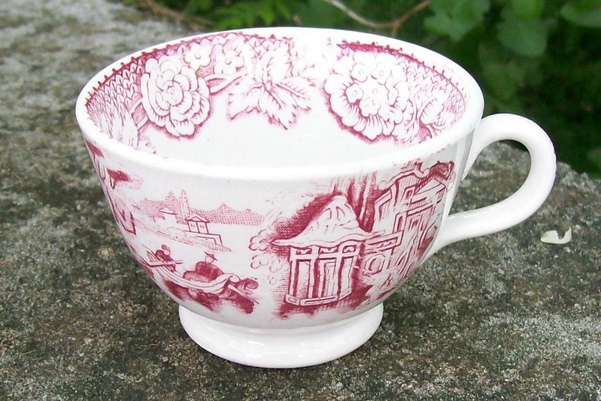 Red transfer-ware handled cup with an oriental scene, circa 1850. Similar to willow pattern, but no tree. Measures 2"h x 3 1/8"d. No maker's mark. Clear glaze appears blue on bottom where it has puddles in the rim. Good condition with only a few popped bubbles in the clay. No saucer. Sold as is. Inglenook Antiques...Established 1989.