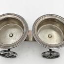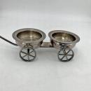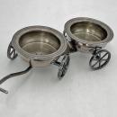 Mid-Century Modern F. B. Rogers Silversmith's Silver Plate Double Wagon Wheel Wine Caddy Holder/Condiment Server. It is very good condition with some patina that can be polished up easily. It is from the 60's. The wheels actually turn. It is very cute. The cups lack liners which would be similar to glass ramikins. Althought you can use this without the liners depending on what it is being used for.