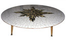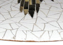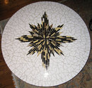 This wonderful table with white ceramic and shimmering glass tiles dates from the 1950s and is in good condition. Its diameter is 40" and height is 13". Original wooden legs are unfinished and have brass feet, and screw into the underside for easy transport and assembly. T are no hallmarks and the maker is unknown. Geometric design in center is crafted from shimmering brown, grey, black and golden colored cut glass tiles. Additional images forwarded upon request. ( jbeik )