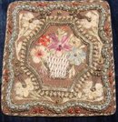 An incredible tour-de-force of needlework is this small gem, combining a myriad of techniques to portray a basket of flowers surrounded by other flowers and borders, all in multicolor silks and silver-gilt threads and sequins. Back is in plain cream silk. A beautiful object for a textile collection or for a doll's house. English or Continental, circa 1810, approximately 2-1/2 inches by 2-1/8 inches.