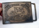 Commemorative Belt Buckle for the Model T by Henry Ford Automobiles. It has very nice details. It is made of metal that has a brass finish on the front. There is some tarnish. The back is numbered. The condition is good.