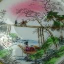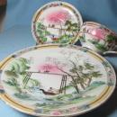 Exceptional hand painted porcelain with Moriage accents. Classic Oriental scene of ming tree, river and bridge. All pieces are excellent with no chips, cracks or hairlines. The plate measures 8 1/2 inch diameter.