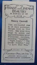 Nancy Carroll Stage and Cinema Beauty Card 1933, Nice card giving brief history of actor. This is card 16 in a series of 35 issued by Godfrey Phillips Ltd. 1 1/2 x 2 1/2 inches