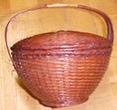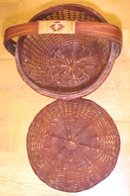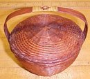 This is a very nicely made covered basket with a very fine and tight weave pattern. This style is sometimes called a sewing basket, as it has a wooden strap handle and a snug fitting cover. It does have a glaze or clear finish over the exterior it appears. This one has no sewing notions compartment inside, or plain inside. It measures 5.5" diameter at the top x 5" tall from the bottom to the top of the handle. The handle strap is very well attached and strong, it extends from the base to the joint at the center top. I don't see any damage on this basket, a few specks of white paint on it here and there. Very nice overall!