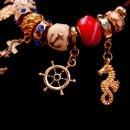These sparkling glass and enamel slide charms reflect the beach. The nautical rhinestone center anchor slide is brilliant in red white and blue enamel. The glass red, blue and off white enamel slides are accented with red, aurora borealis rhinestone clear slides Well made and much prettier in person. Perfect for the traveler.