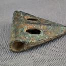 Sturdy cast in two halves with a triangular blade, a medial ridge flanked with two oblong openings, and a small round eye for inserting a wooden socket.