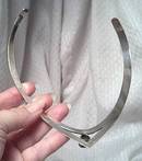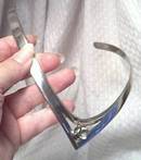 A really cool piece of vintage Mexican sterling. This is a neck cuff, from probably the mid 1970's, from the stamp. The mark is "MEXICO/TP-25/925". The large clear folied glass stone is collet set in the center of the "V" at front center. The stone has lost some of it's foil. There are numerous surface scuffs and scratches and some dark spots. Someone really loved this piece and wore it a lot! But, with a good cleaning, it has a lot of life left in it. The cuff starts out at about 3/8" wide and the back and is approx. 1" wide at the "V". The cuff measures approx. 14" around the inside. It lays very nicely around the front throat. There is a "shadow" of a number on the inside, 92809. I think this is some kind of inventory number, personal or estate sale, maybe. The shipping fees quoted are for Priority/No Insurance in USA.
