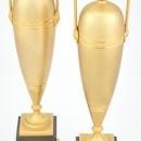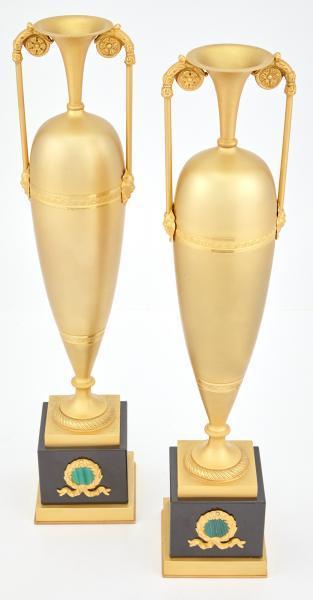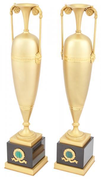 Our pair of gilt metal urns feature square pedestals with marble veneers and malachite medallions. Each 18 inches tall and in good condition. Believed to date from the last quarter of the 20th century.
