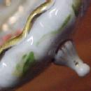 Raised gold glitter enameled around the flowers of red and orange. This is footed with a small amount of the gold enamel warm from use. This does not take from the elegance of this piece. Buyer pays S.+ H. "We accept Visa, MasterCard, Discover and American Express via Paypal, or payment with a money order or check. We will ship within 24 hours if paid with a money order or Paypal. Payment with a check will delay shipping."