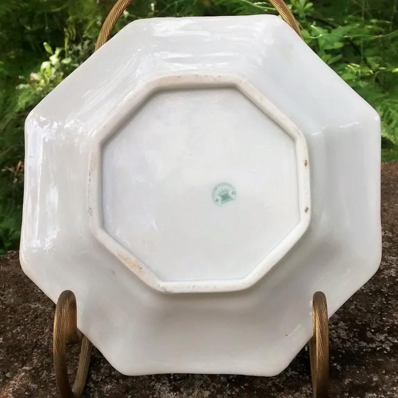 Nippon hand-painted octagonal dish, decorated with landscapes and florals. 1891-1921. Measures 7"d. Marked with crown mark #8 as shown. Gold trim. Very good condition with no chips or cracks. Inglenook Antiques...Established 1989.