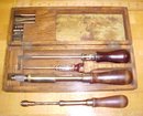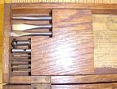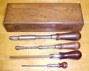 This is a quality tool set with 3 screwdrivers, and one extra push drill included, plus the standard accessories. The box is marked "NORTH BROTHERS MFG. CO. YANKEE PHILADELPHIA PA. U.S.A." on the partial black and gold label on the top inside of the nice oak box. The label on the top outside of the wooden box is in about 70% intact condition, some of the remaining label is a bit fragile. There is another marked noted on the inside label that reads "YANKEE TOOL SET NO. 100" and an inventory list of "NO. 30 SPIRAL RATCHET SCREW DRIVER, NO. 11 RATCHET SCREW DRIVER, NO. 15 RATCHET SCREW DRIVER, CHUCK AND DRILL ATTACHMENT, COUNTERSINK". The set is complete according to the list, accept for the No. 15 screwdriver is a No. 15A screwdriver made by Stanley England, and the No. 10 is replace by a newer No. 10A also made in England, both are basically the same tools that North Brothers had in these set originally, and fits into the box, and the chuck is the correct size to hold the drill adapters, countersink, and the screwdriver tips. The No. 10A is near like new condition, very crisp and clean, appears to have never been used. Marked "STANLEY NO. 10A STANLEY TOOLS SHEFFIELD ENGLAND". The No. 15A is in very good condition, about 99% like new on the steel, as you can see, some of the thick rosewood stain has come off, otherwise the wood handle is very nice. The 15A is marked "STANLEY NO. 15A STANLEY TOOLS SHEFFIELD ENGLAND". The No. 30 is in good condition with about 80% nickel plating intact, and about 50% handle finish intact, works great. We note a small ding on the nickel plated handle ferrule, not bad, the spiral ratchet system works smoothly. This one is marked "YANKEE NO. 30 NORTH BROS. MFG. CO. PHILA PA. U.S.A. PAT.NOV.3.08" and some other earlier patents also. All screwdriver handles are well attached, no cracks. The No. 30 can be used as a spiral drill as this set includes a 8 drill point set plus the adapter so that the smaller diameter drill points will fit in the screwdriver chuck, via the adapter. There is also a countersink and three screwdriver tips provided, all for the No.30 all in good++ to new condition. We are also including a rare early North Brothers push drill with a hardwood handle, since the set included 8 drill points that fit right into the screw type chuck on the push drill. The push drill will not fit into the oak box, but is included. The push drill is marked "YANKEE NO. 42 NORTH BROS. MFG. CO. PHILA PA. U.S.A. PAT.OCT.9.00" and a few other earleir patent dates also. The push drill is in Good++ condition, and very solid hardwood handle with some rosewood stain still intact, no cracks, the spiral drive system works great. It measures about 10" long, and is better suited for drilling small holes than the No. 30 screwdriver, so we included it with the No. 100 set. The oak box is custom factory made, very nice wood, good hardware, and corner box joints, and rounded corners on the top. The wood case measures 4.2 x 12.2" long, has some minor finish wear, not cracked, nice grain, good hinges and latches. A very nice set with a nice antique push drill included!