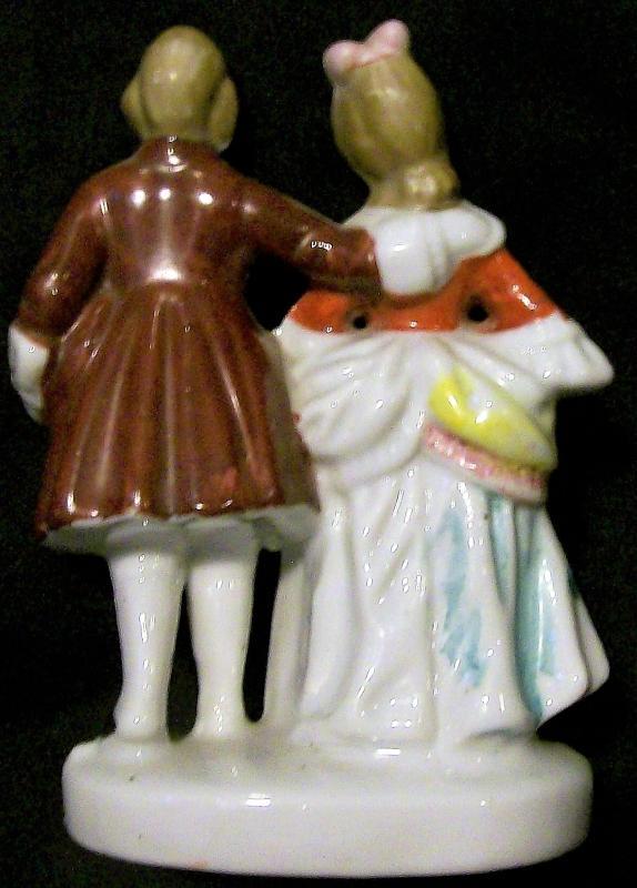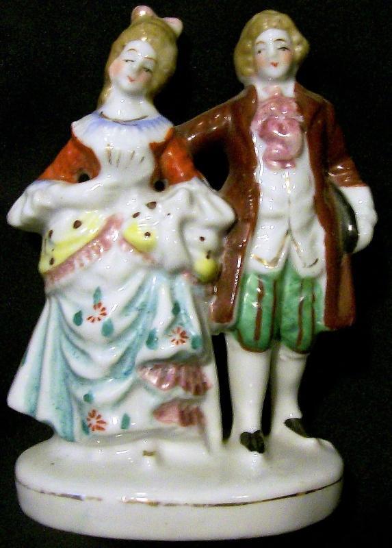 Colonial couple figurine made in Occupied Japan, 1945-52. Black mark on bottom. Hand-painted multicolor shiny glazes with gold trim. Measures 4.75"h. No chips or cracks. Inglenook Antiques...Established 1989.