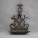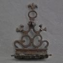 The Lamp is composed of three separately cast bronze elements, joined together by pegs and soldered at the back. The backplate is decorated in openwork with scrollwork motifs adorned with a notched pattern. Shamash flanked by a pair of birds, the top surmounted by a suspension ring with a fleur-de-lis finial. Bottom affix with oil holder with four square oil containers, each with two pronounced spouts for wicks.