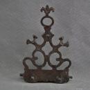 This Hanukkah lamp is decorated with openwork scrollwork motifs and adorned with two small birds, showing Polish influence. It resembles Hanukkah lamps used by Polish Ashkenazic Jews.