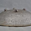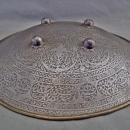The shield's border is decorated with a wide band featuring 18 oval and round cartouches, each containing Qur'anic inscriptions in the Arabic calligraphic script "inasta'liq." The edge is reinforced with a brass band that is applied and riveted to the shield.