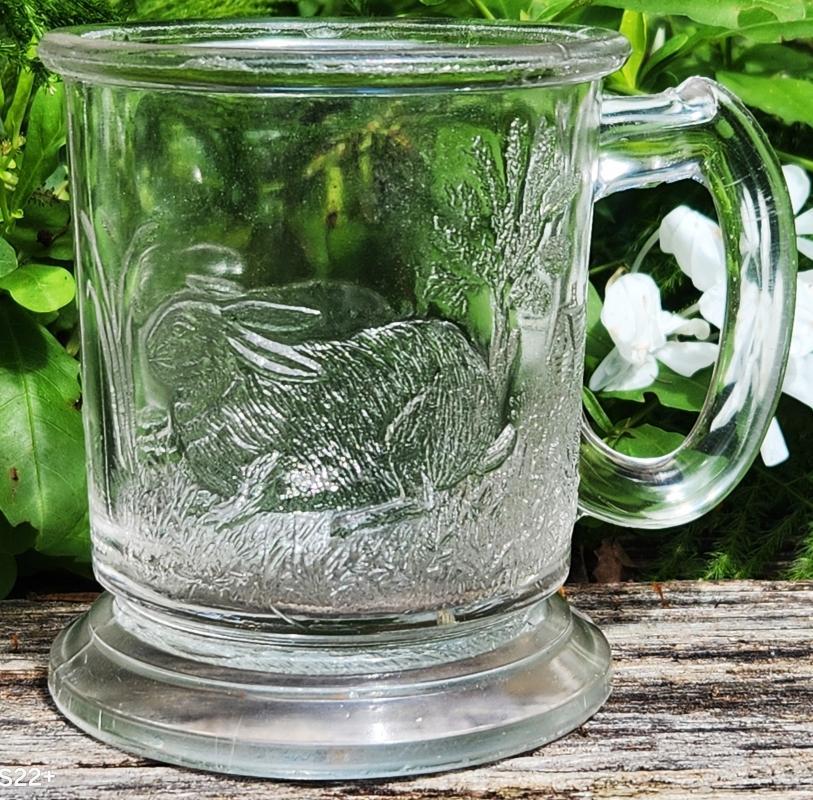 Clear glass child's mug in the "Rabbit and Lamb" pattern, #353, made by Challinor, Taylor & Co. of Tarentum, Pennsylvania, circa 1884-91. Measures 3 3/8"h. Good condition with only minor roughness to seams; no large chips or cracks. Sold as is. Inglenook Antiques...Established 1989.