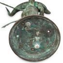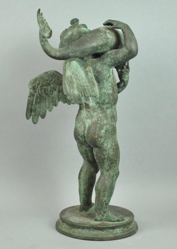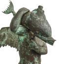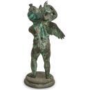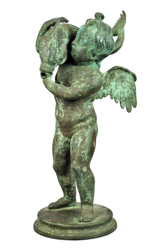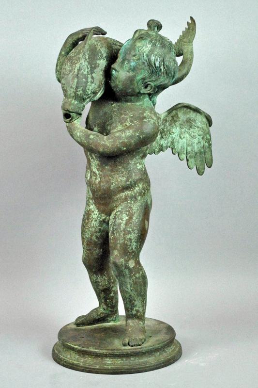 Our bronze fountain, after the ancient unearthed at Pompeii, depicts a cherub holding a dolphine. 24 1/4 inches tall. Attributed to the Chiurazzi foundry of Naples, late nineteenth century. With considerable verdigris throughout, with original copper tubing and two drilled mounting holes in the base.