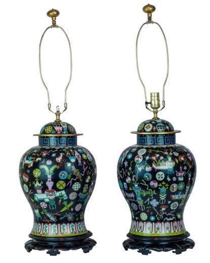 Antique Chinese Kuang Hsu Charcoal Cloisonne Ginger Jar Table Lamps