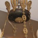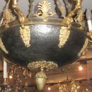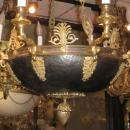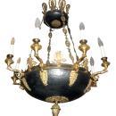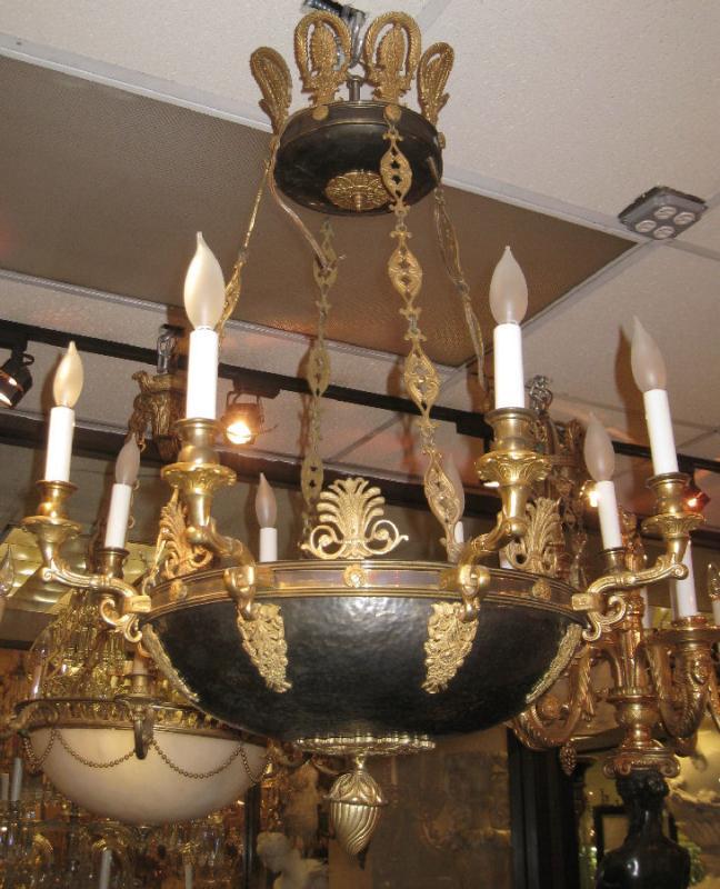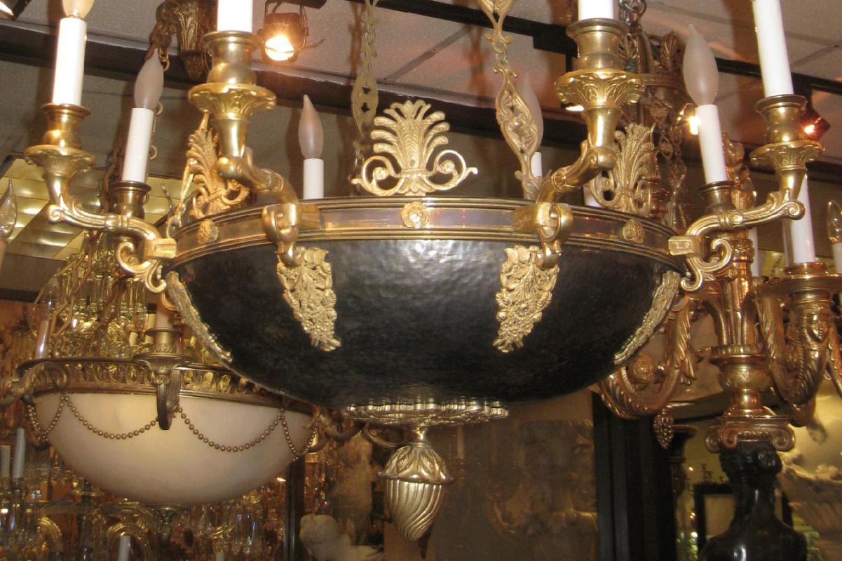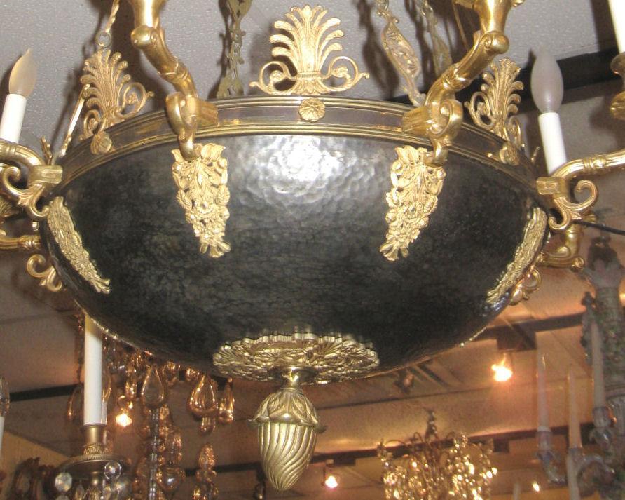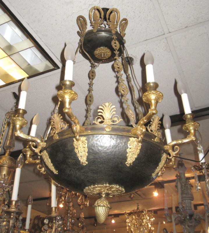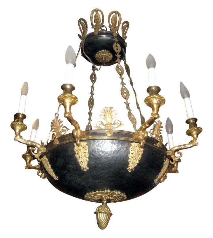 This wonderful antique chandelier, crafted from patinated and gilt metal (believed to include tin and brass), features eight electrified candle arms with modern sockets and wiring, and is ready for installation. Measures approximately 38" across.