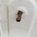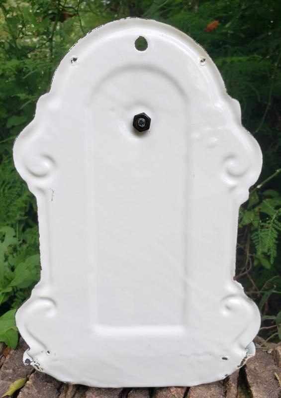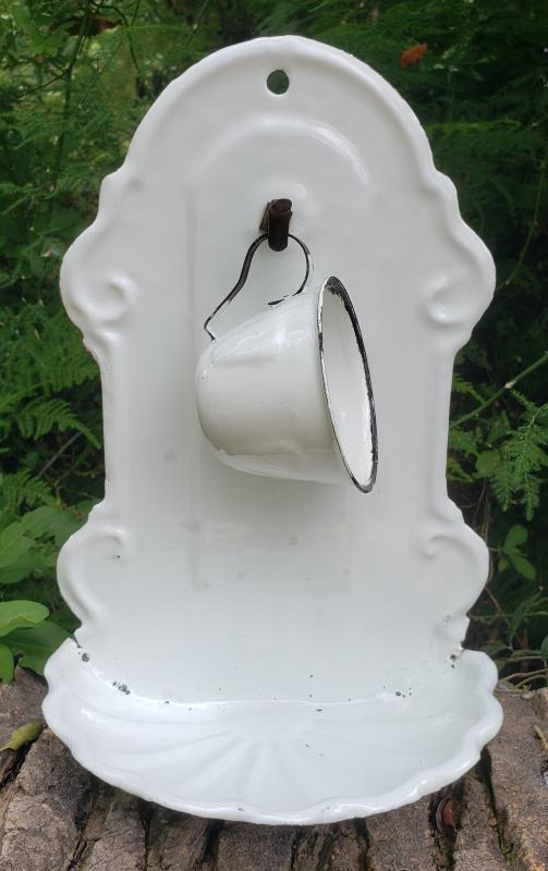 White enamelware wall-mount soap dish with black trim. Small hook holds cup (included). Dates from the early 1900s. Measures 10.5"h x 7.25"w. Overall good condition with only a few chips as shown. Sold as is. Great for kitchen, bathroom, or outdoor shower. Inglenook Antiques...Established 1989.